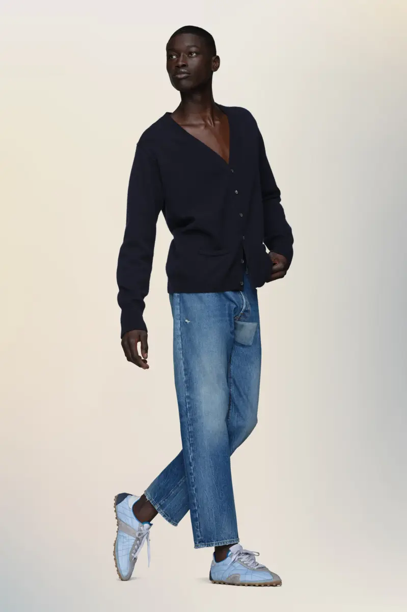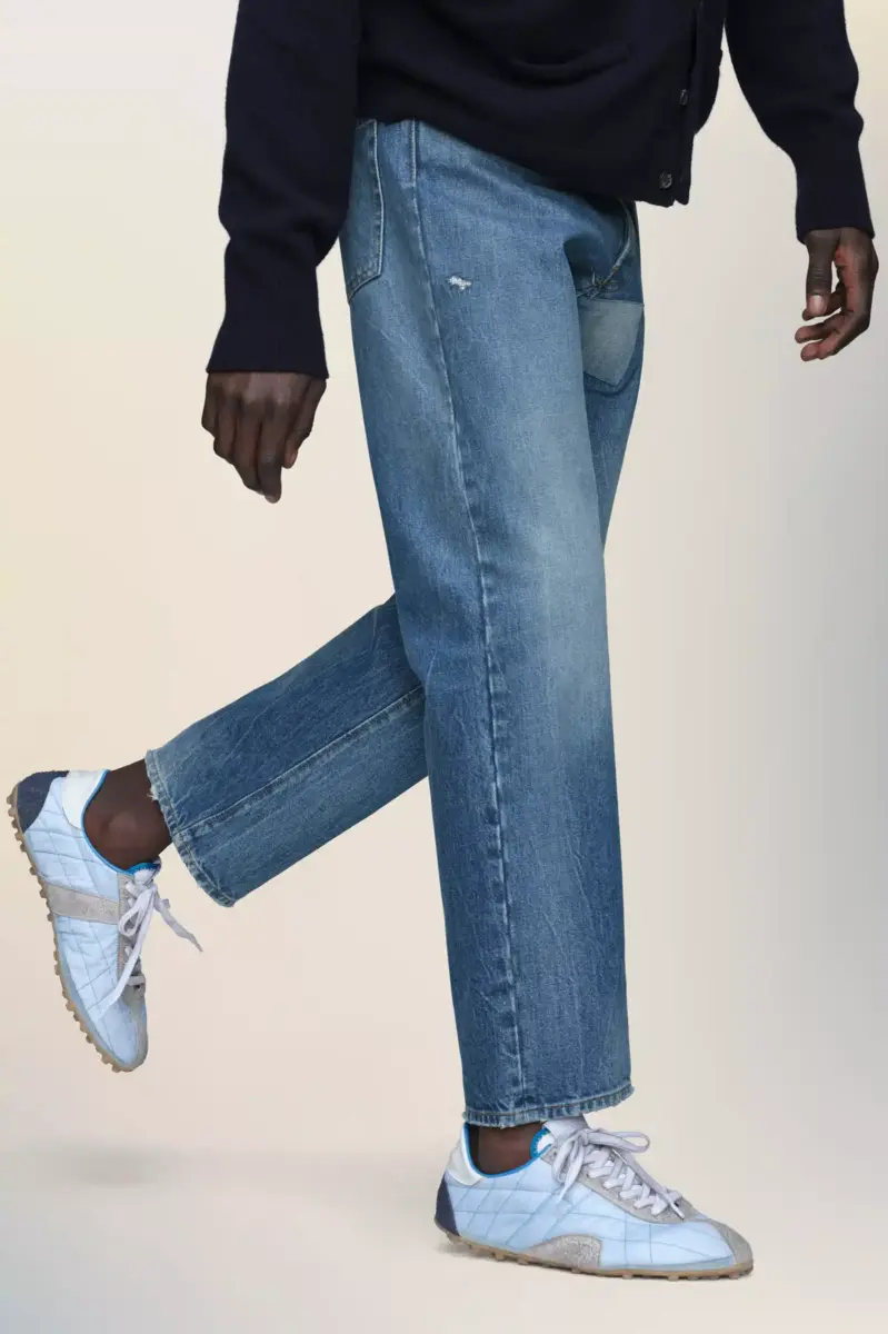 Realizzati in denim sbiadito con leggere abrasioni, questi jeans presentano una toppa tono su tono sul retro che evoca il concetto Memory of della Maison, catturando la traccia di ciò che era una volta. La firma di Maison Margiela, le quattro cuciture, appare sul retro, l’opposto di un’etichetta.