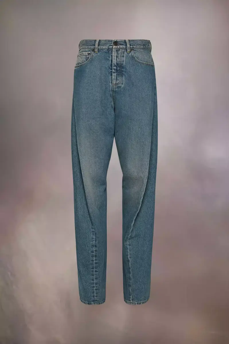 I jeans presentano pannelli tagliati in diagonale per un effetto cucitura ritorta. Sono dotati di cinque tasche e gancio Margiela insieme alla toppa con logo Memory Of. La firma di Maison Margiela, le Quattro cuciture, è presente sul retro, l’opposto di un’etichetta.