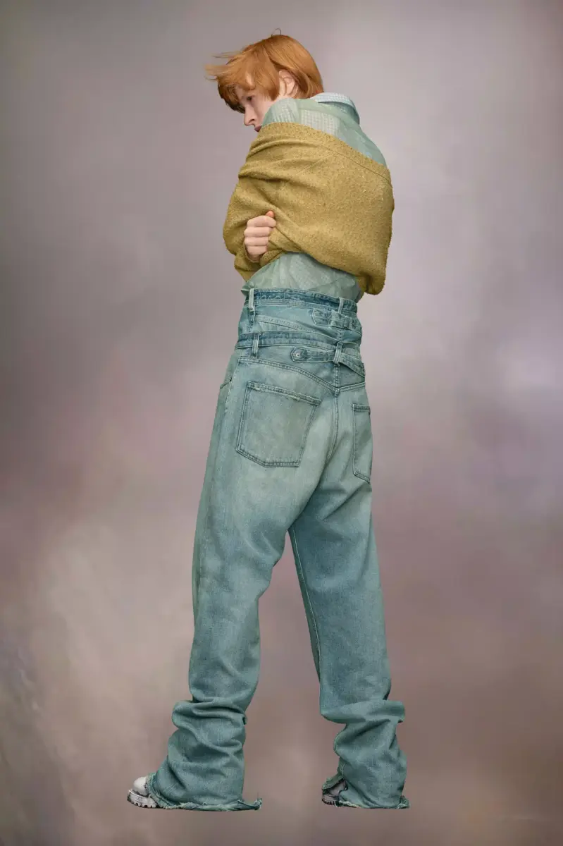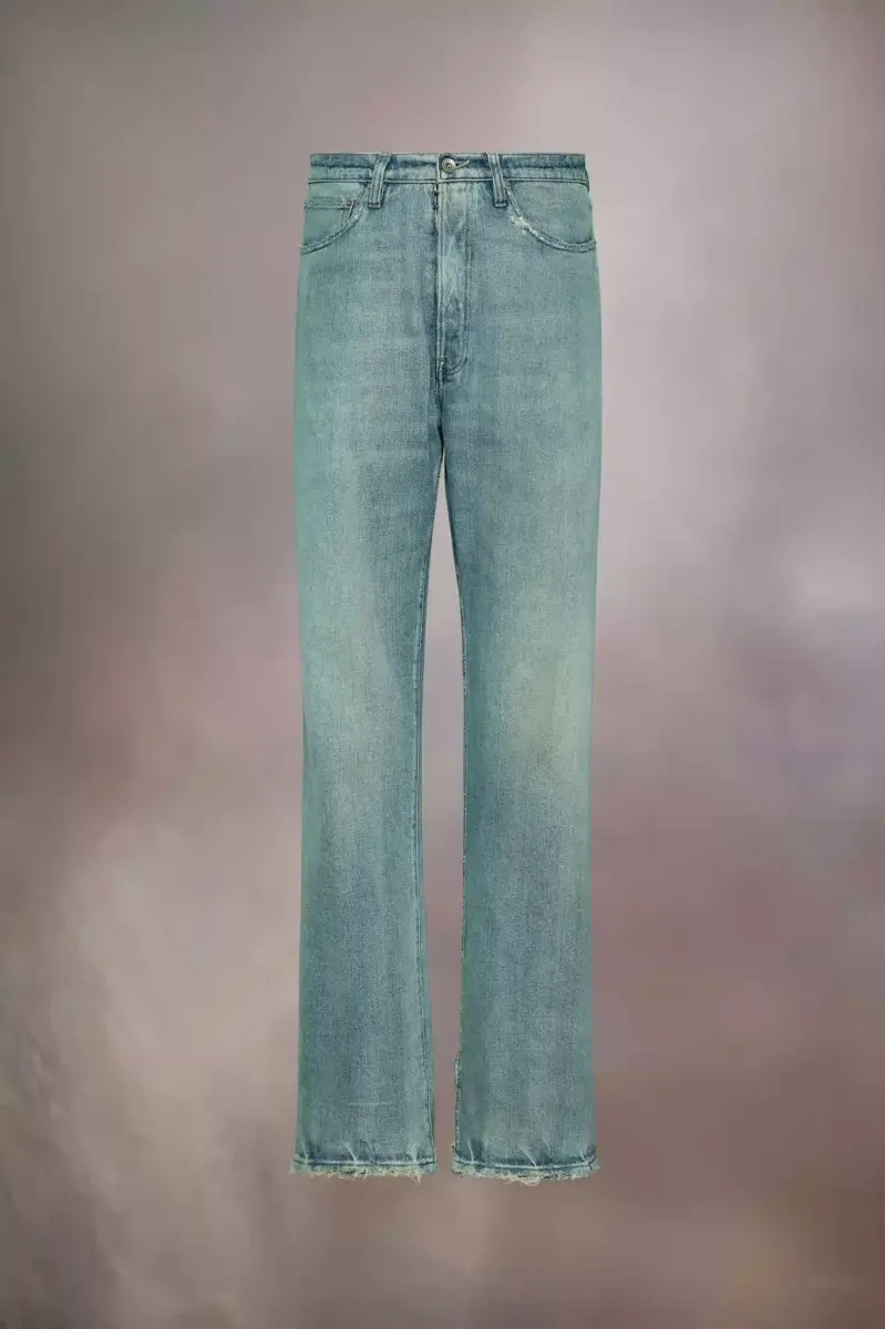 In denim effetto used per un look vissuto, i jeans a gamba dritta presentano una fibbia sul retro per una vestibilità regolabile. Presentano il classico stile a cinque tasche, passanti per cintura e chiusura a gancio Margiela. I bordi sfrangiati sottolineano ulteriormente il tema. La firma di Maison Margiela, le quattro cuciture, è visibile sul retro, l’opposto di un’etichetta.