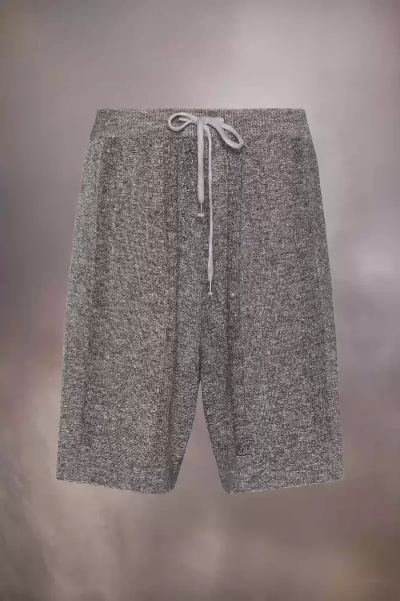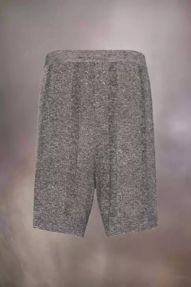 Tagliati sopra il ginocchio, questi shorts dalla vestibilità comoda sono realizzati in misto lino e cotone con una delicata colorazione chiné, rifiniti con un delicato effetto rigato. Presentano orli a coste e una cintura a coste con coulisse che ricorda i lacci usati. La firma di Maison Margiela, le quattro cuciture, è visibile sul retro, l’opposto di un’etichetta.