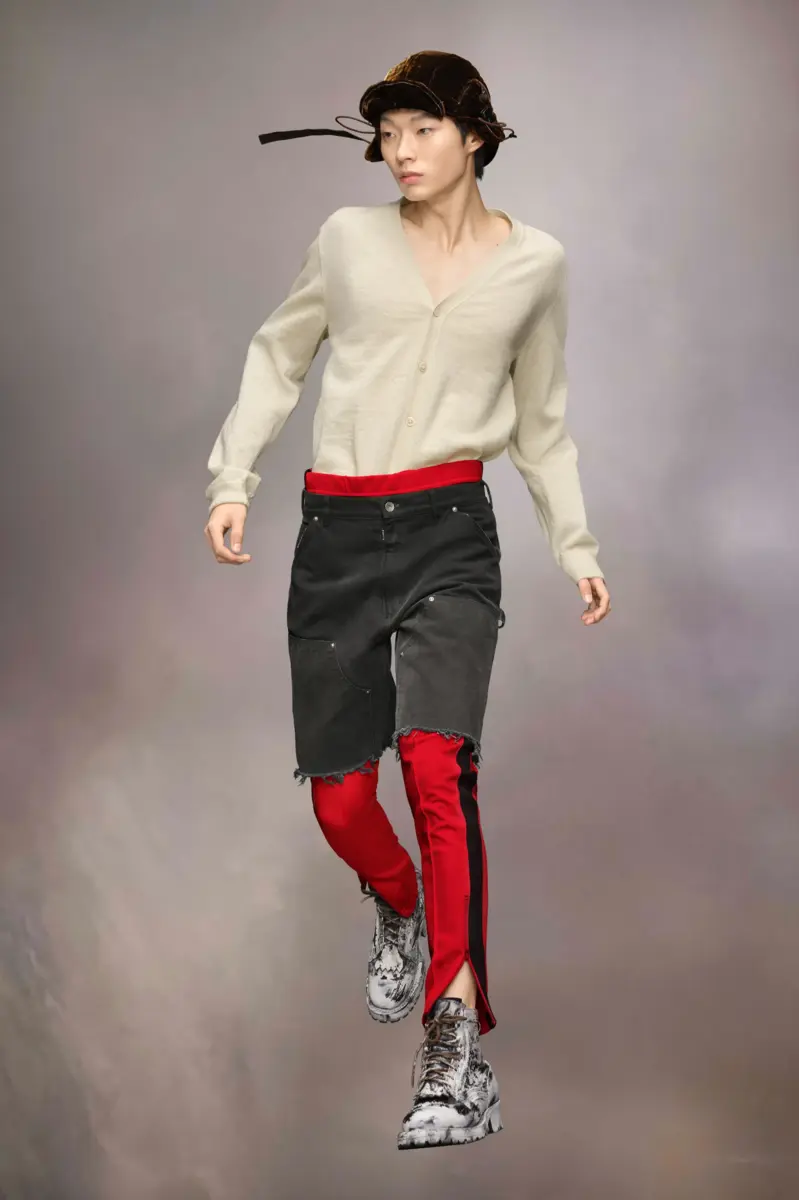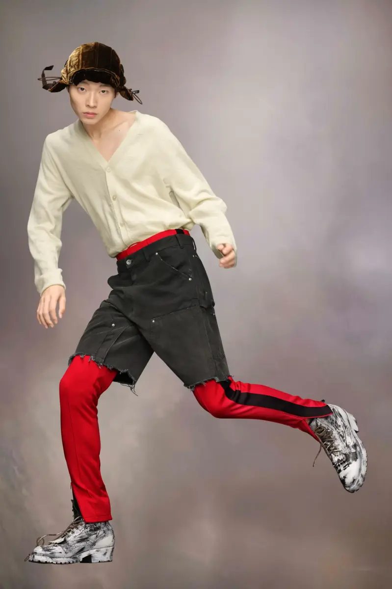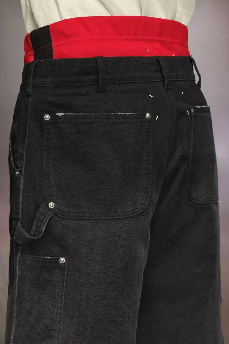 I pantaloncini in denim presentano bordi sfrangiati e effetto consumato e borchie. Le tasche, comprese quelle laterali, si fondono con un passante per un aspetto pratico. Sono dotati di passanti per cintura e chiusura con gancio Maison Margiela. La firma di Maison Margiela, le quattro cuciture, è visibile sul retro, l’opposto di un’etichetta.