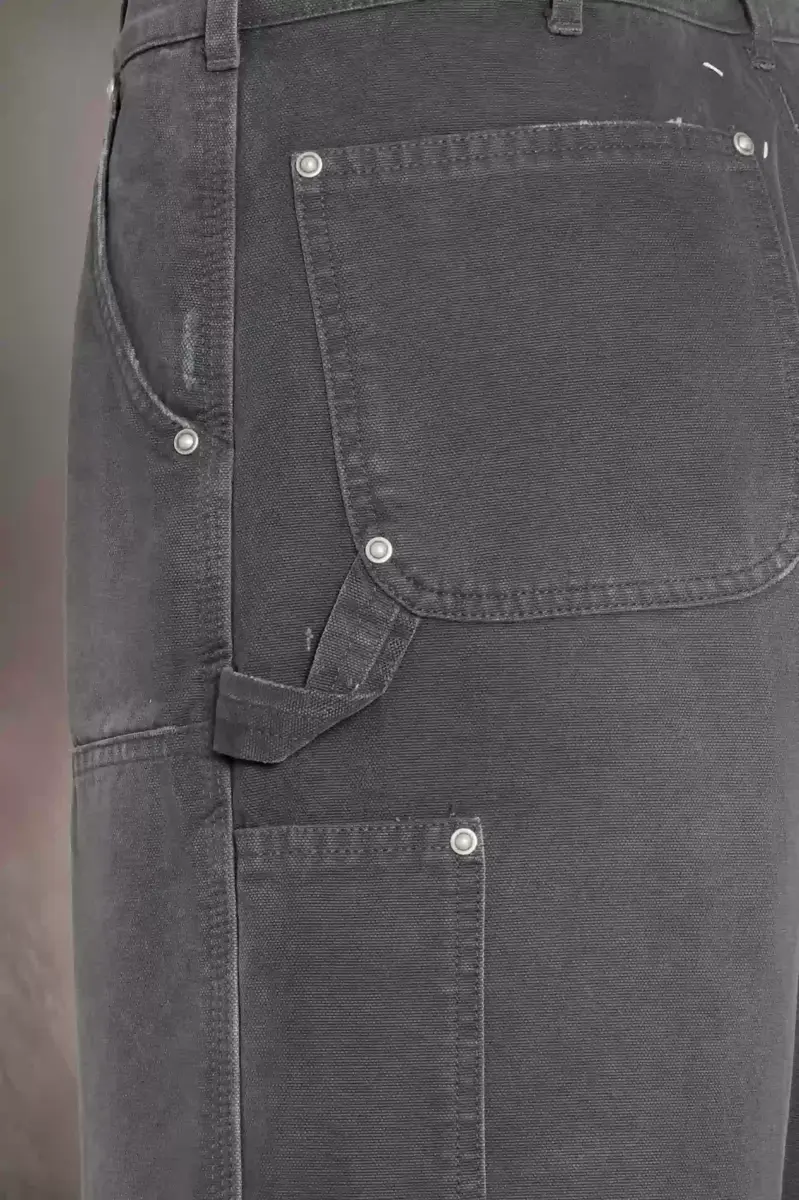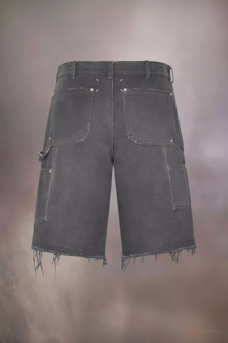 Gli shorts in denim presentano bordi sfrangiati e dettagli con borchie. Le tasche, tra cui quelle tagliate lateralmente, si fondono con un passante per un aspetto pratico. Sono dotati di passanti per cintura e chiusura con gancio Margiela. La firma di Maison Margiela, le quattro cuciture, è visibile sul retro, l’opposto di un’etichetta.