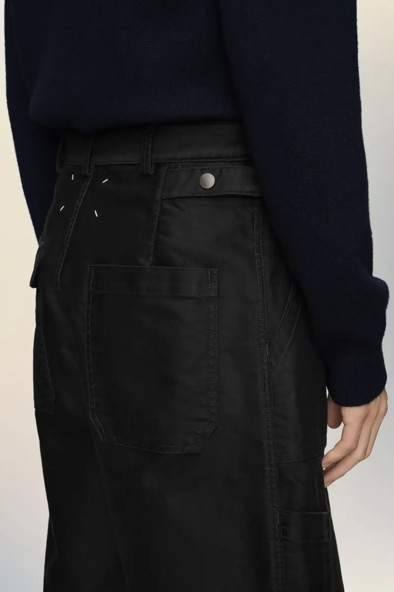 Realizzati in raso di cotone con un intenso lavaggio stone wash, questi shorts presentano tasche di ispirazione utility e una silhouette sartoriale. L’orlo presenta sottili pieghe, testimonianza della tecnica Memory of the Hem della Maison, che conserva tracce di lavorazioni precedenti. La firma di Maison Margiela, le quattro cuciture, è visibile sul retro, l’opposto di un’etichetta.