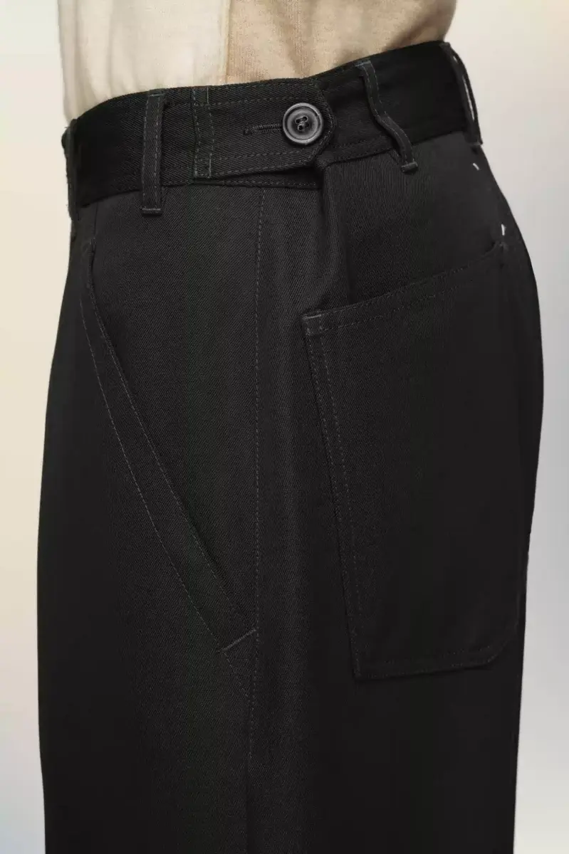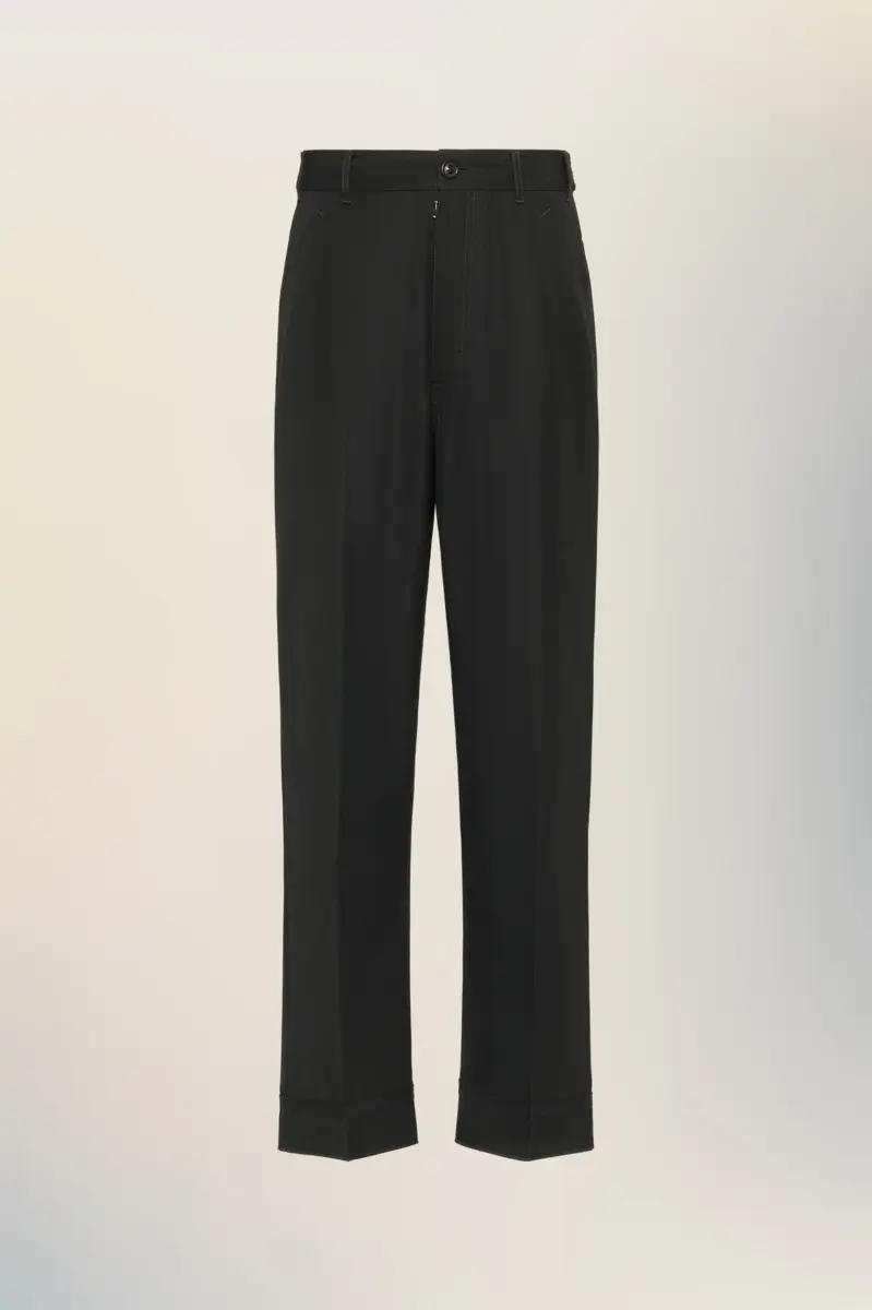 Questi pantaloni a gamba larga presentano pieghe precise, vita alta e orli con risvolto. Le tasche posteriori applicate e le linguette laterali regolabili creano un equilibrio tra funzionalità e forma. Sul retro, compaiono le quattro cuciture distintive della Maison; l’opposto di un’etichetta.