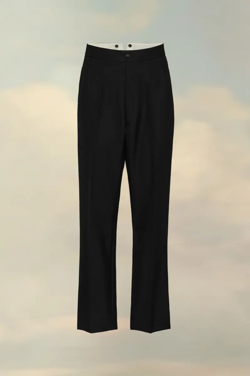 Questi pantaloni in lana a spina di pesce sono plissettati e presentano il bottone M e la chiusura con gancio e occhiello Maison Margiela. Hanno una parte posteriore regolabile con tasca aggiuntiva e sono rifiniti con quattro cuciture bianche che mostrano la mano della Maison: l’opposto di un’etichetta.