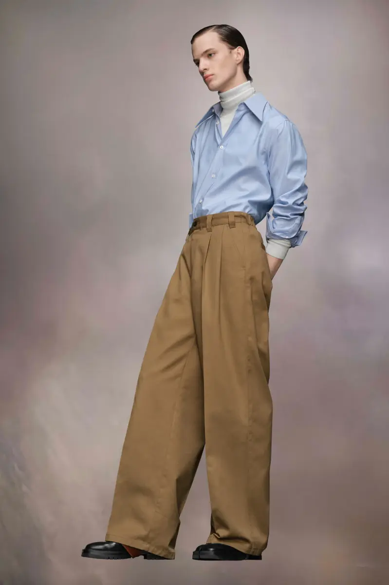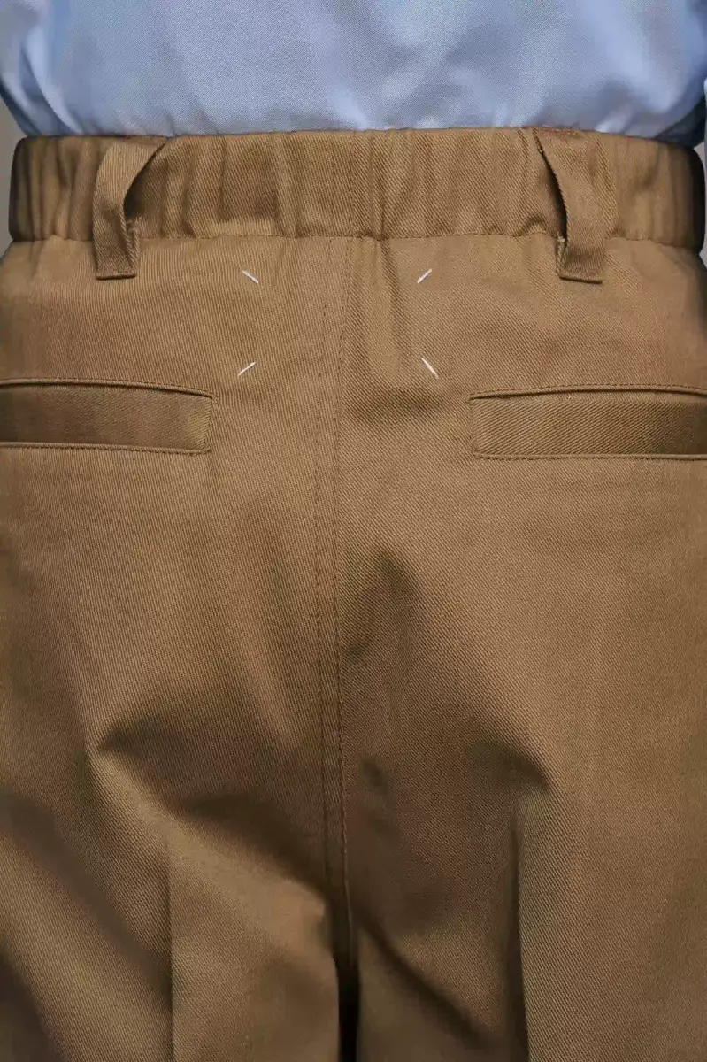 Con vita alta e pinces, i pantaloni chino skater ampi presentano il gancio Margiela. Il retro è elasticizzato, con tasche laterali e posteriori. La firma di Maison Margiela, i Quattro punti, è presente sul retro, l’opposto di un’etichetta.
