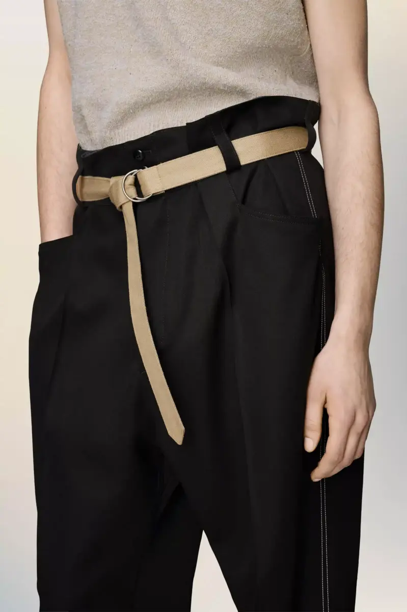 Realizzati in tela di lana, questi pantaloni sono definiti da linee pulite e una vita alta, che abbina la precisione sartoriale al contrasto funzionale. Una cintura in fettuccia aggiunge un tocco pratico, rafforzando il tono funzionale del capo. La firma di Maison Margiela, le quattro cuciture, è visibile sul retro, l’opposto di un’etichetta.