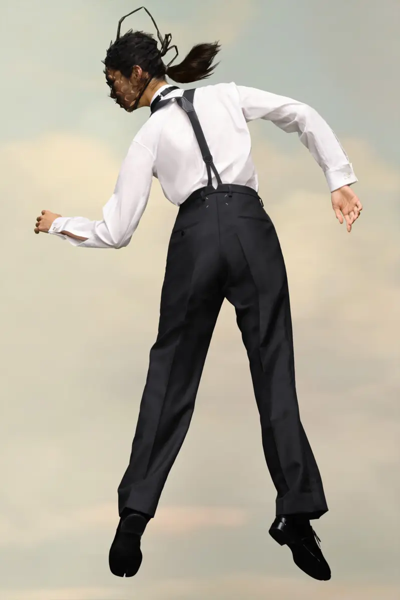 I pantaloni con pinces in mohair britannico presentano una striscia a contrasto lungo i lati, passanti per cintura e un piccolo ritaglio sul retro. Sono dotati di due tasche posteriori. La firma di Maison Margiela, i quattro punti, è visibile sul retro, l’opposto di un’etichetta.