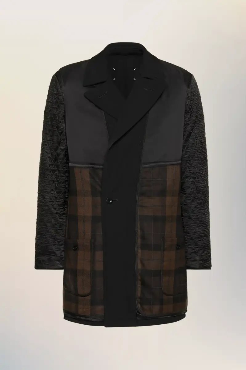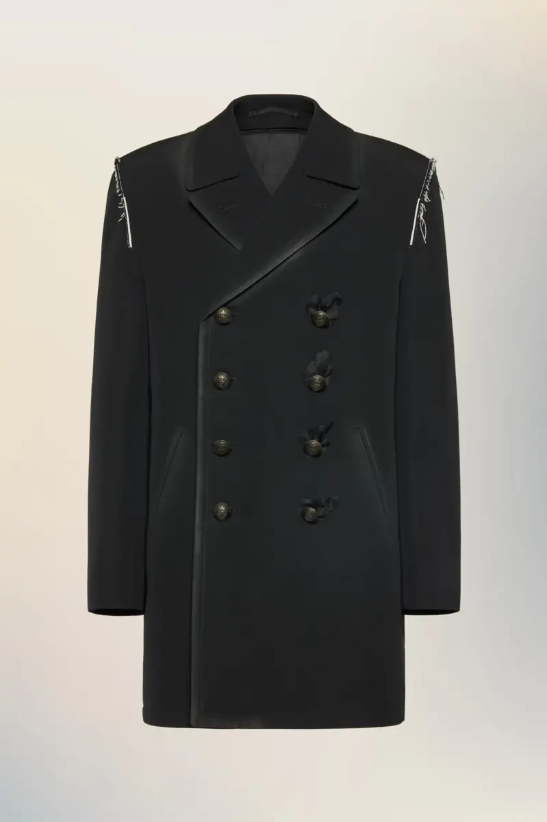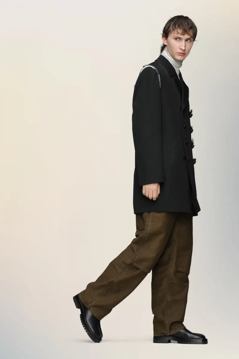 In un design in stile militare, questo cappotto reversibile doppiopetto in lana è stato trasformato attraverso il processo Pressed to Death della Maison, dove calore, pressione e pittura a mano rimodellano il tessuto con linee audaci e una finitura luminosa. La firma di Maison Margiela, i quattro punti, appare sul retro; l’opposto di un’etichetta.