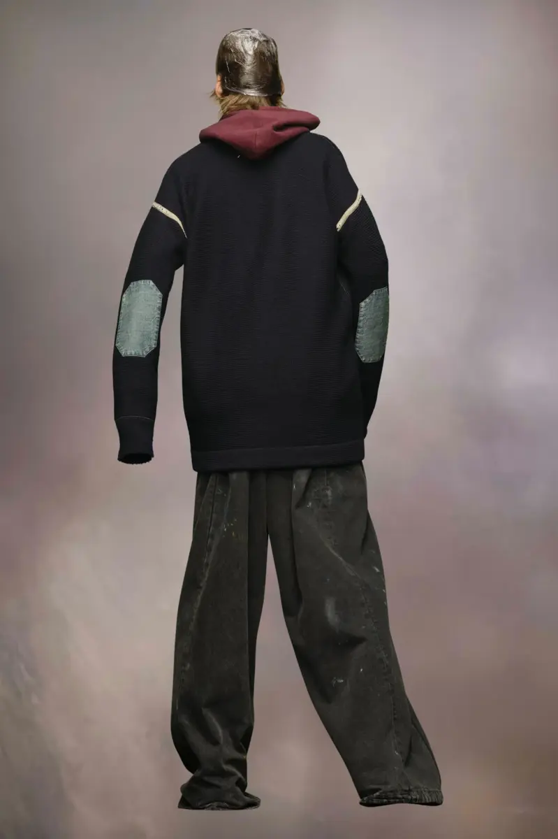 Questo cardigan in maglia con scollo a V presenta toppe sui gomiti a contrasto in denim e profili sfrangiati sulle spalle. La firma di Maison Margiela, le quattro cuciture bianche, è visibile sul retro, l’opposto di un’etichetta. Finezza 7.