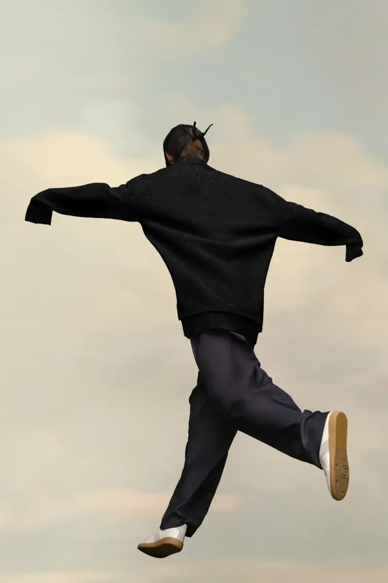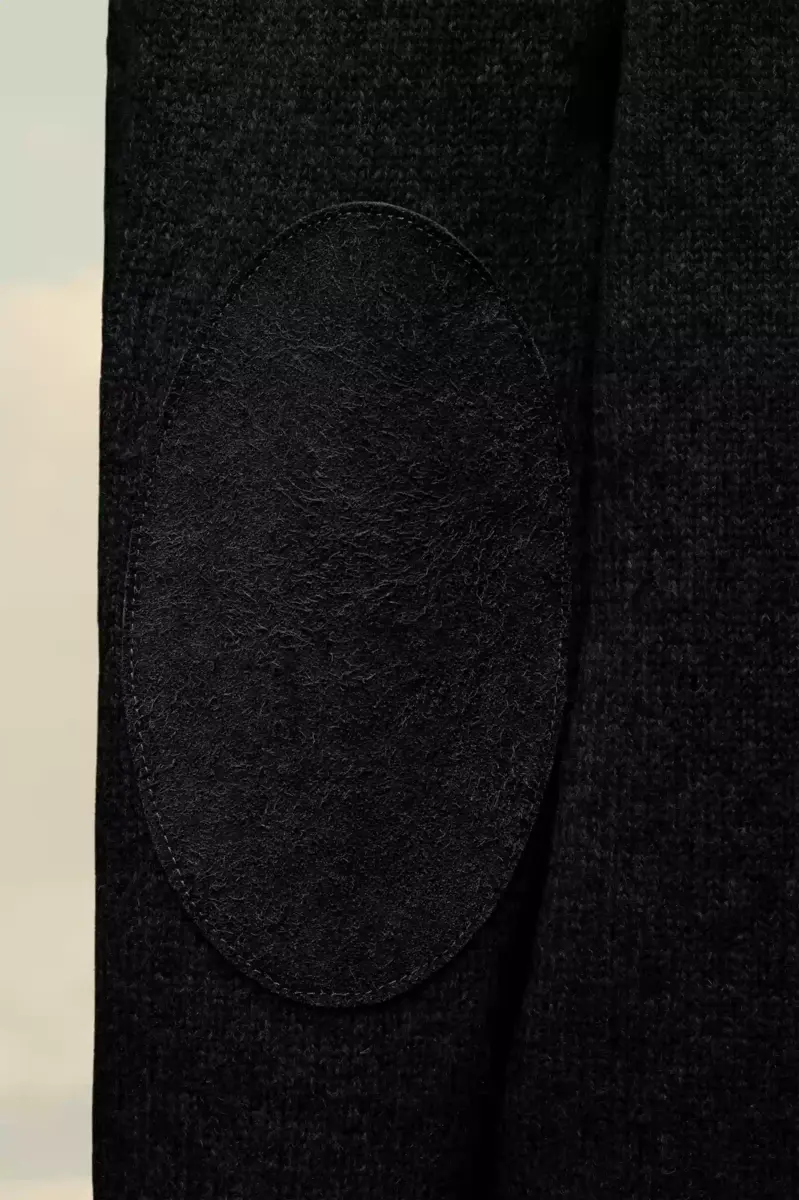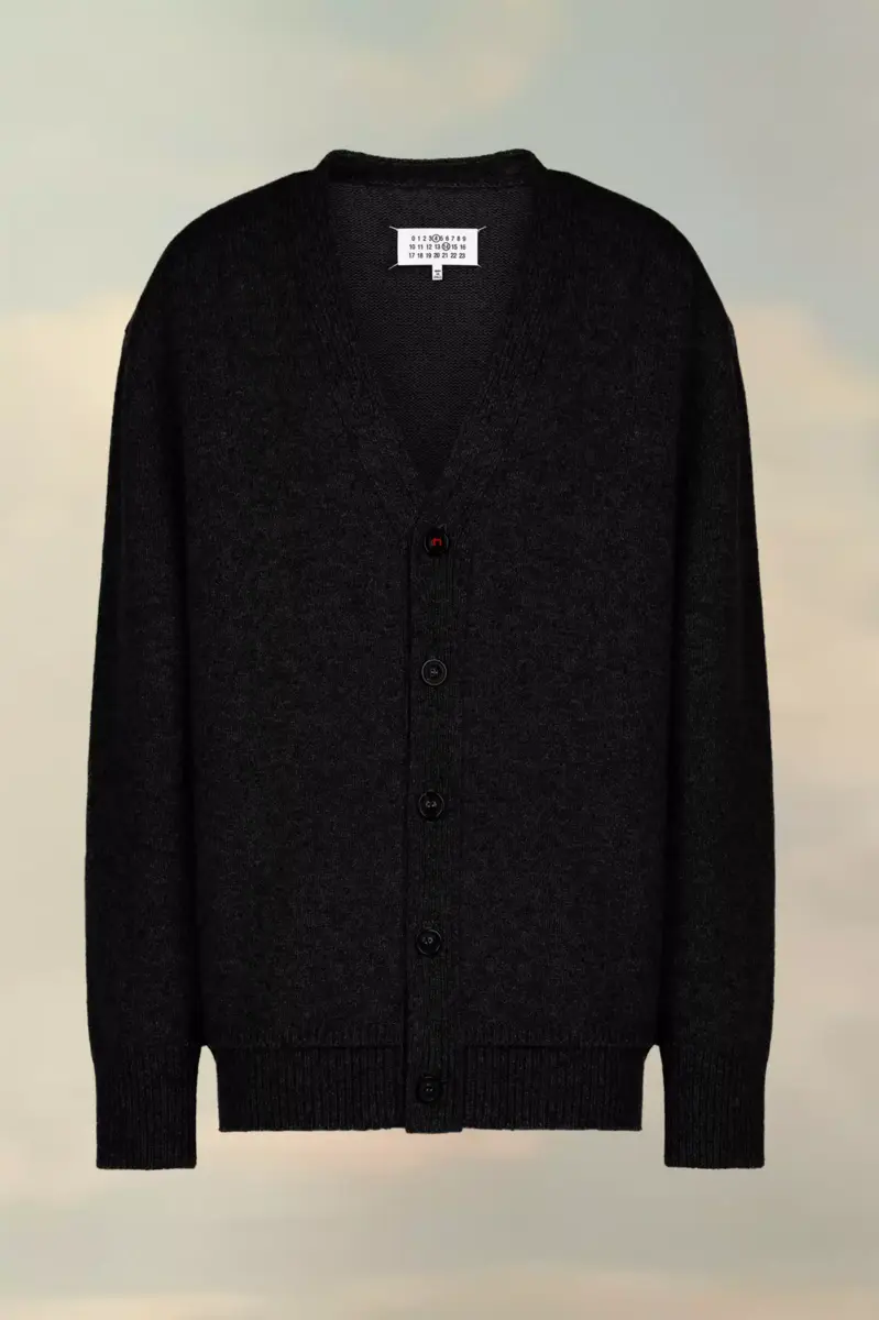 Questo cardigan in maglia con scollo a V profondo, maniche lunghe e bordi a coste presenta toppe sui gomiti tono su tono. Sul retro, quattro cuciture bianche mostrano la firma della Maison: l’opposto di un’etichetta. Finezza 5.