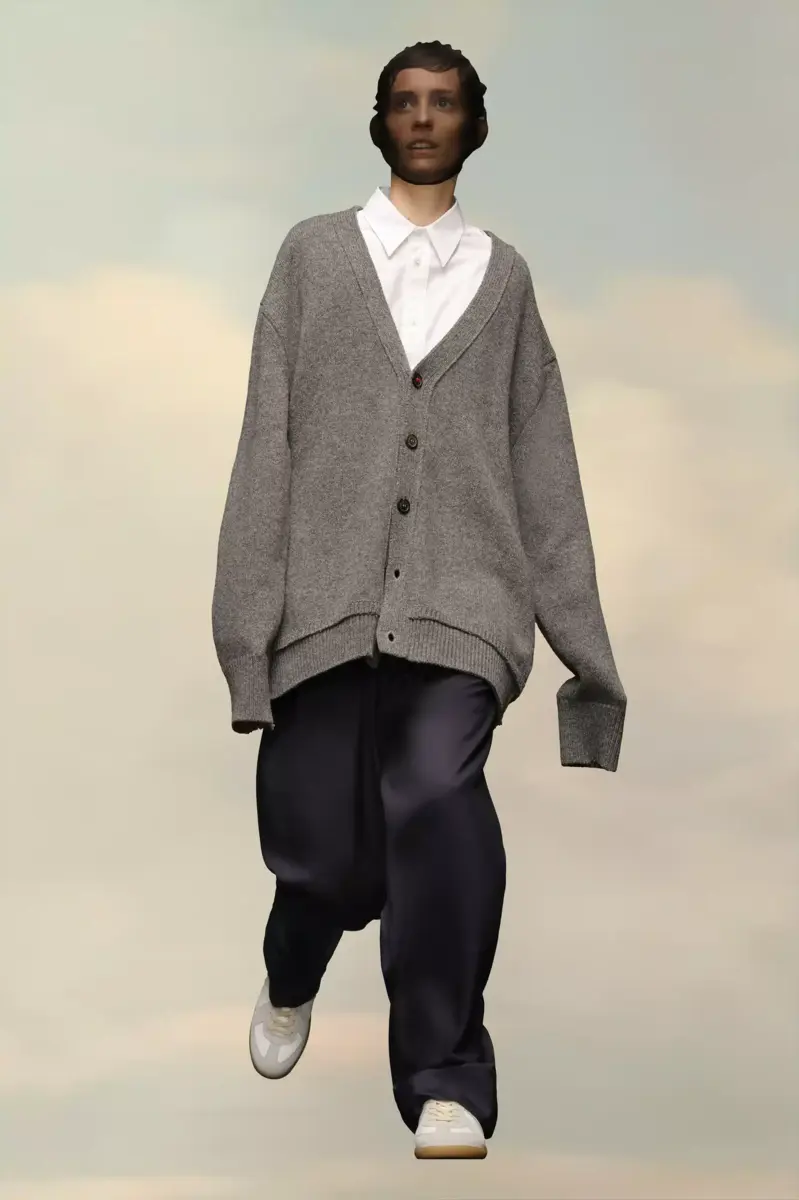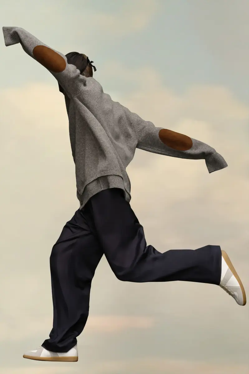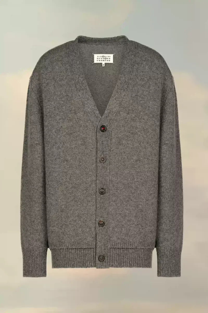 Questo cardigan in maglia con scollo a V profondo, maniche lunghe e bordi a coste presenta toppe sui gomiti tono su tono. Sul retro, quattro cuciture bianche mostrano la firma della Maison: l’opposto di un’etichetta. Finezza 5.