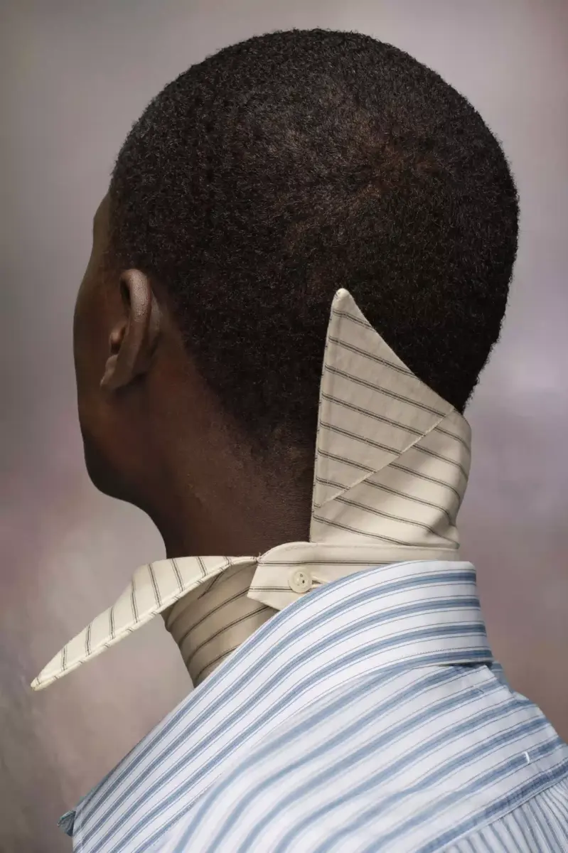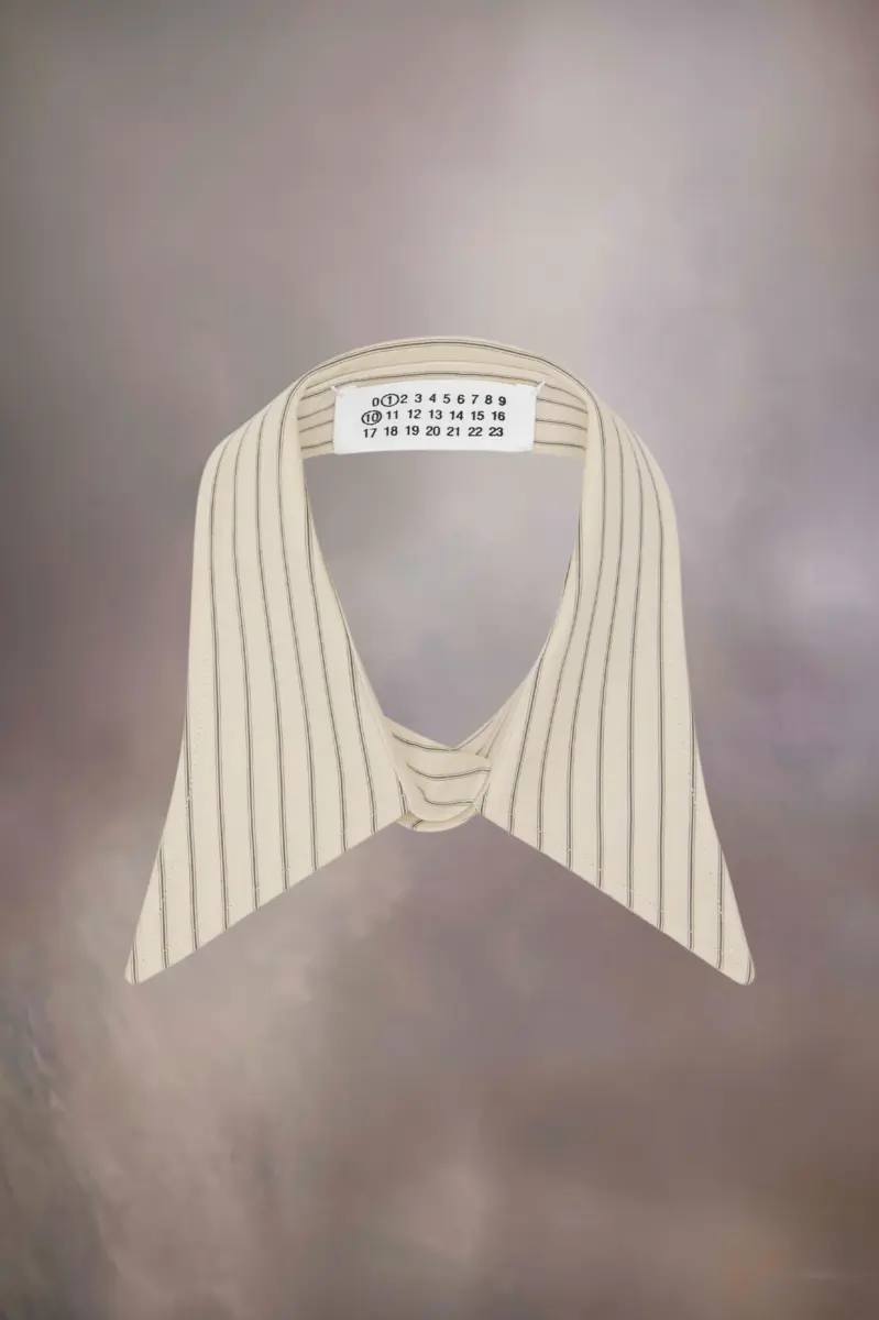 Realizzato in cotone, questo accessorio da collo ha un design a punta con chiusura a bottone singolo e stampa a righe. Può essere indossato nella sua forma tradizionale o sfilato lateralmente. Il logo numerico è presente all’interno, con i numeri 1 e 10 cerchiati (collezioni donna e uomo), a indicare la sua natura genderless.