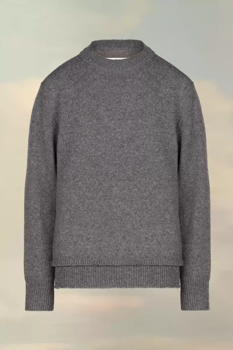 Questo maglione girocollo con maniche lunghe e bordi a costine presenta toppe sui gomiti tono su tono. Sul retro, quattro cuciture bianche mostrano la firma della Maison: l’opposto di un’etichetta. Finezza 5.