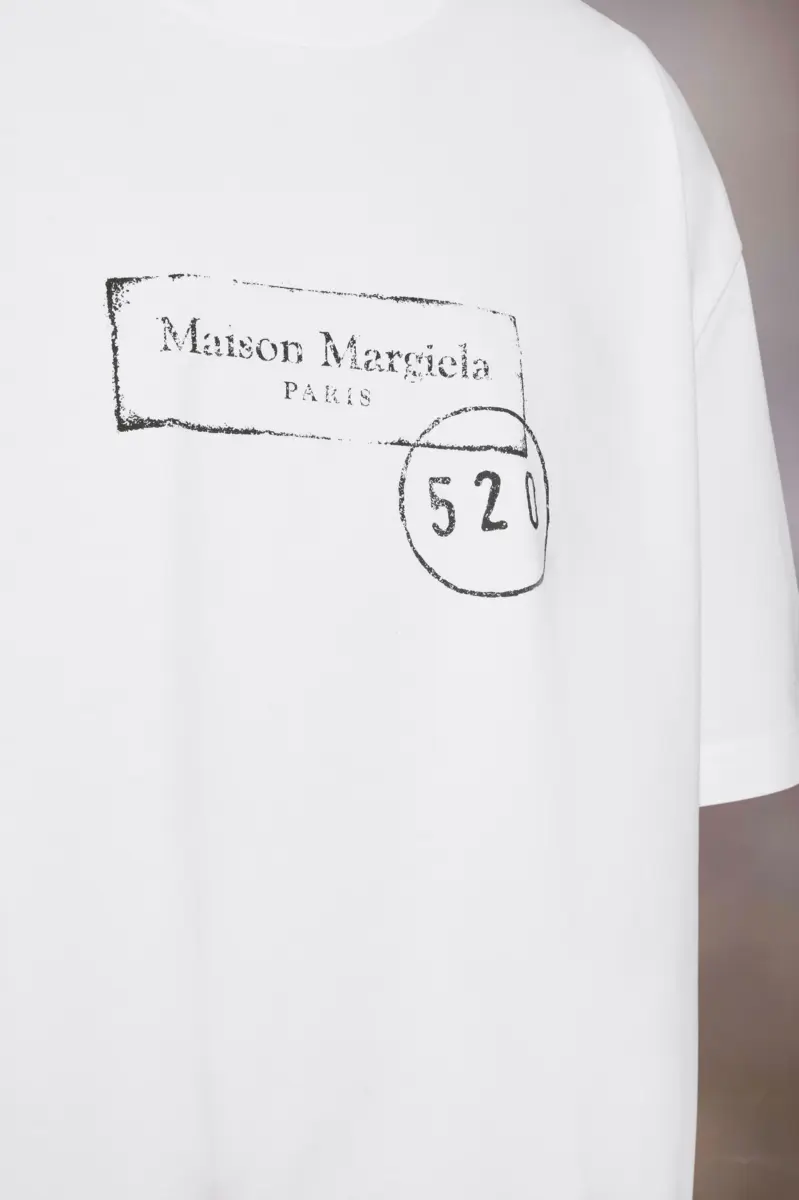 Contornata da uno scollo rotondo e proporzioni rilassate, la T-shirt presenta una grafica contemporanea sul petto ispirata ai timbri industriali d’archivio. Minimale nella forma ma ricca di riferimenti, è rifinita con i quattro punti bianchi della Maison; l’opposto di un’etichetta.