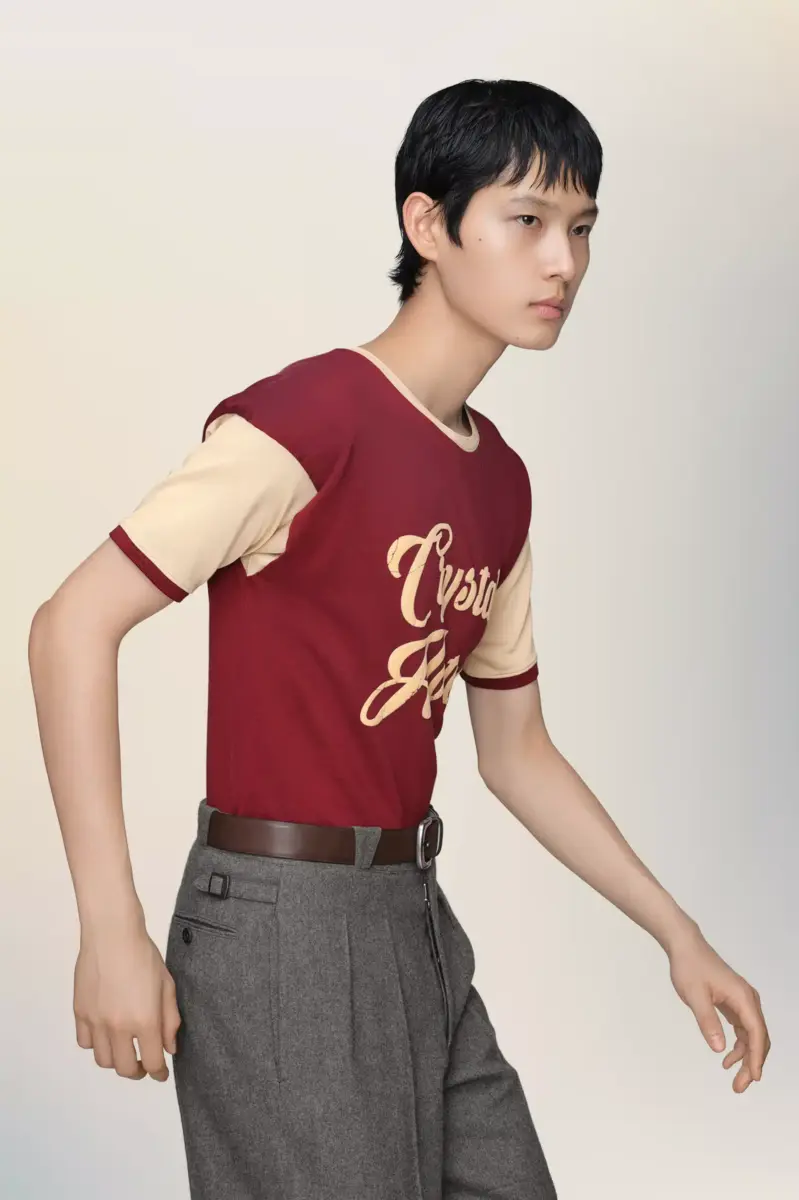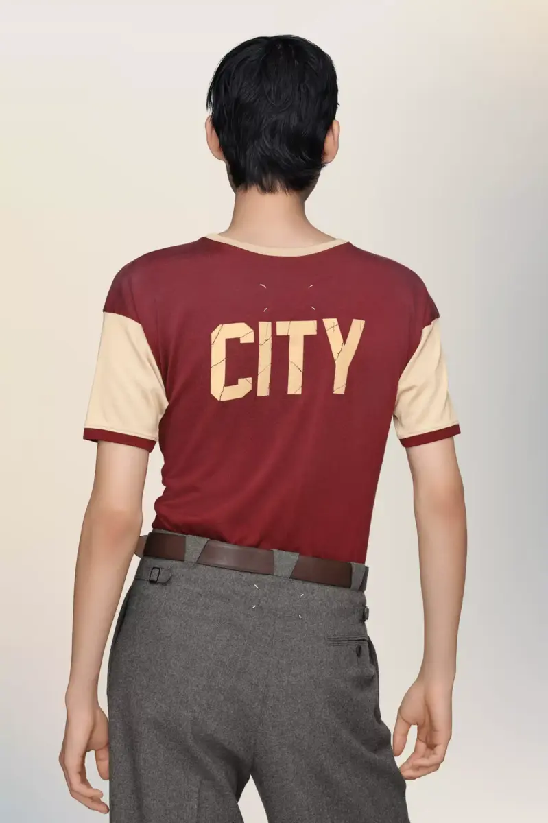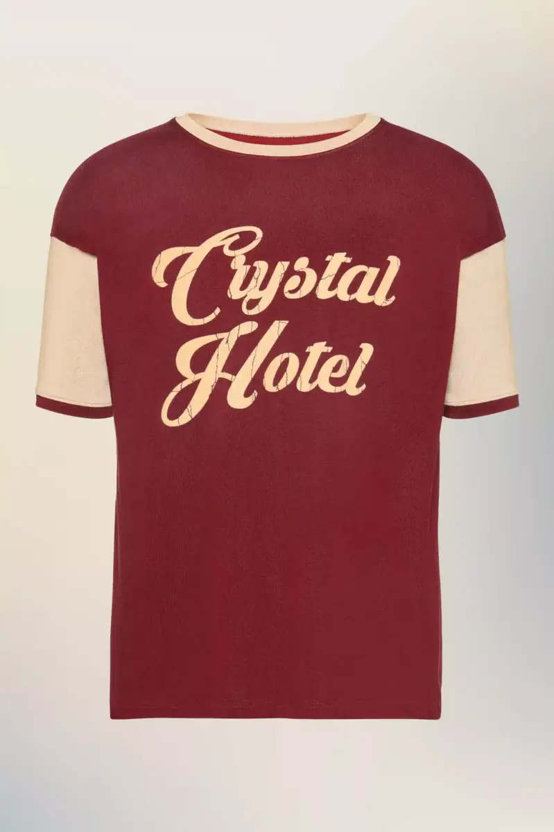 Questa t-shirt bicolore è stampata con un logo retrò “Crystal Hotel” in stampa craquelé, che riecheggia il linguaggio nostalgico dei cimeli delle vacanze. La sua struttura morbida e il colletto tono su tono si ispirano a modelli sportivi vintage, reinterpretati con un tocco di sobrietà. La firma di Maison Margiela, i quattro punti, è visibile sul retro, l’opposto di un’etichetta.