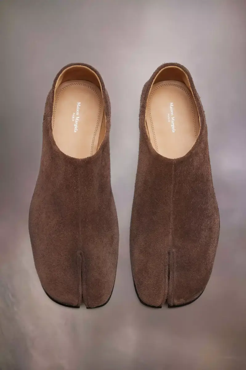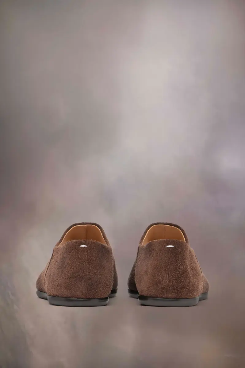 Realizzate in pelle scamosciata, le babbucce presentano la punta divisa Tabi. Lanciate per la collezione di debutto della Maison nel 1989, ispirate all’omonimo calzino tradizionale giapponese del XV secolo, catturano lo spirito avanguardista e insubordinato della Maison. Un classico della tradizione, continuamente esplorato in ogni collezione. La cucitura bianca distintiva di Maison Margiela appare sul retro.