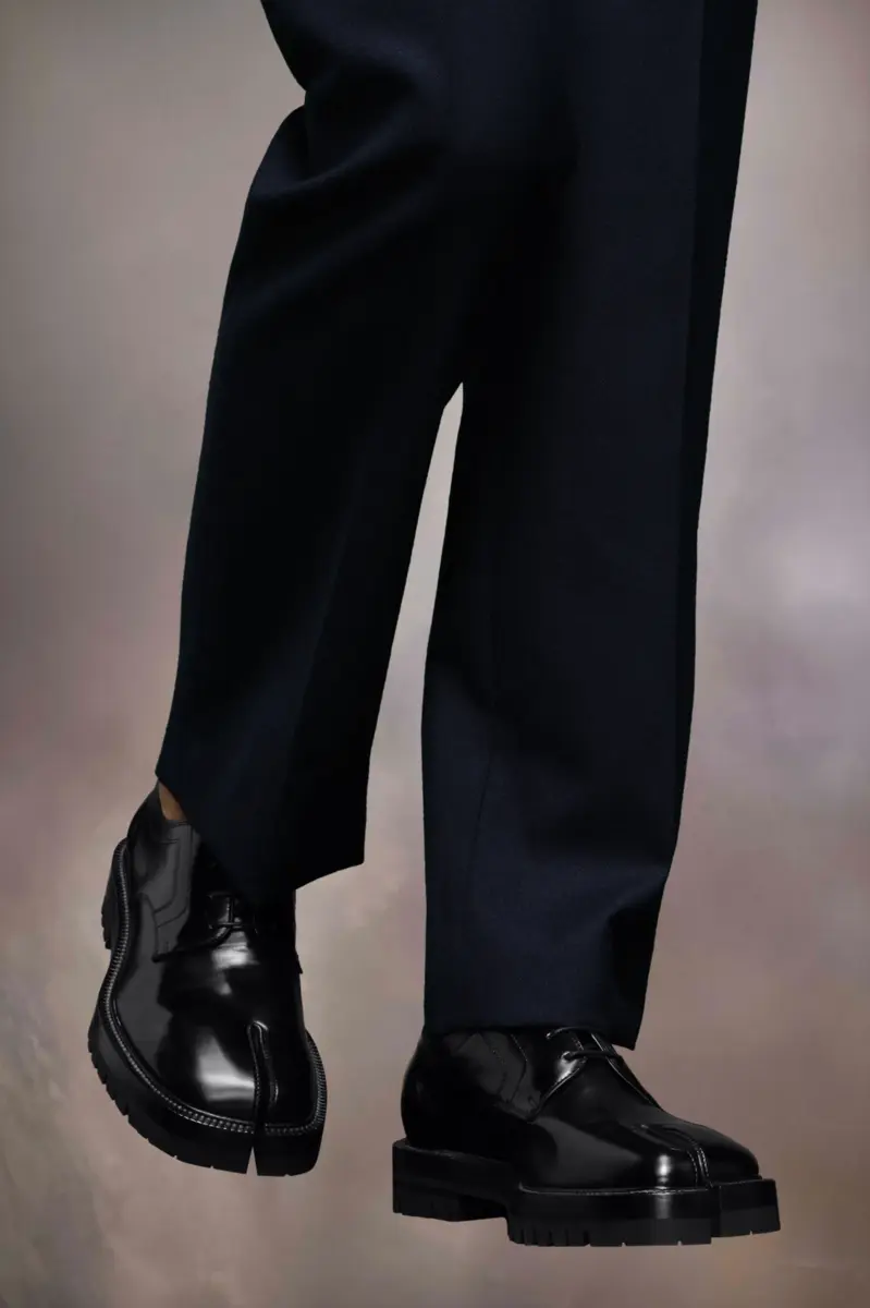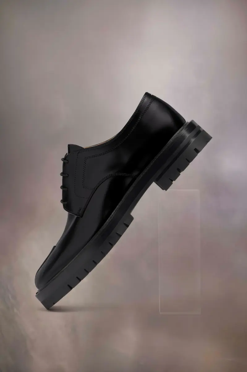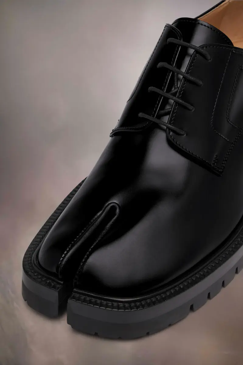 In pelle di vitello spazzolata, le scarpe stringate presentano una suola spessa con tacchetti e la punta divisa Tabi, ispirata al tradizionale calzino giapponese del XV secolo che porta lo stesso nome, lanciato per la collezione di debutto della Maison nel 1989. Cattura lo spirito avanguardista e insubordinato della Maison e si presenta come un classico della tradizione, continuamente esplorato in ogni collezione.