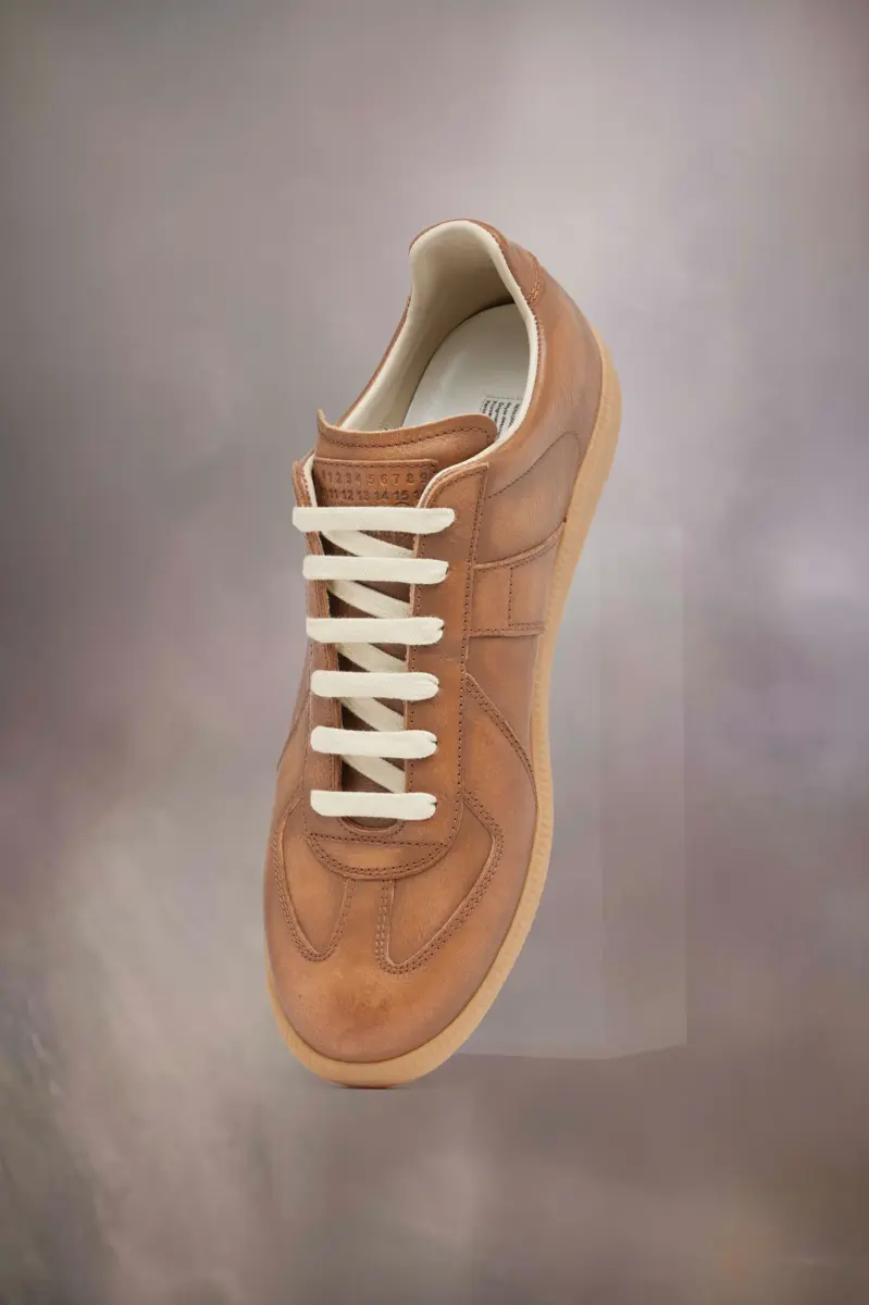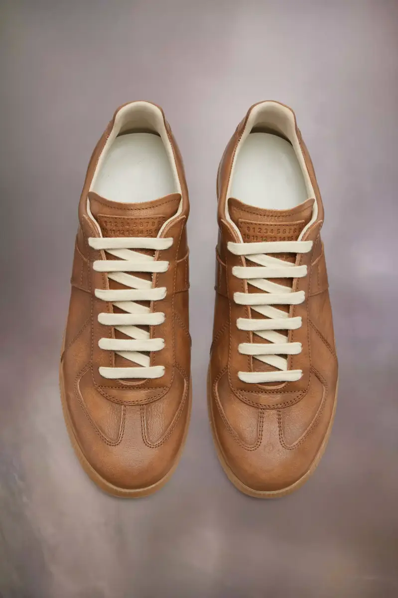 Le sneakers Replica in pelle di vitello conciata al vegetale con effetto délavé sono rifinite con una classica suola in gomma. L’iconico modello Replica della Maison si ispira alle scarpe sportive austriache degli anni Settanta. I dettagli delle Replica vengono continuamente rielaborati in linea con le ispirazioni della stagione.