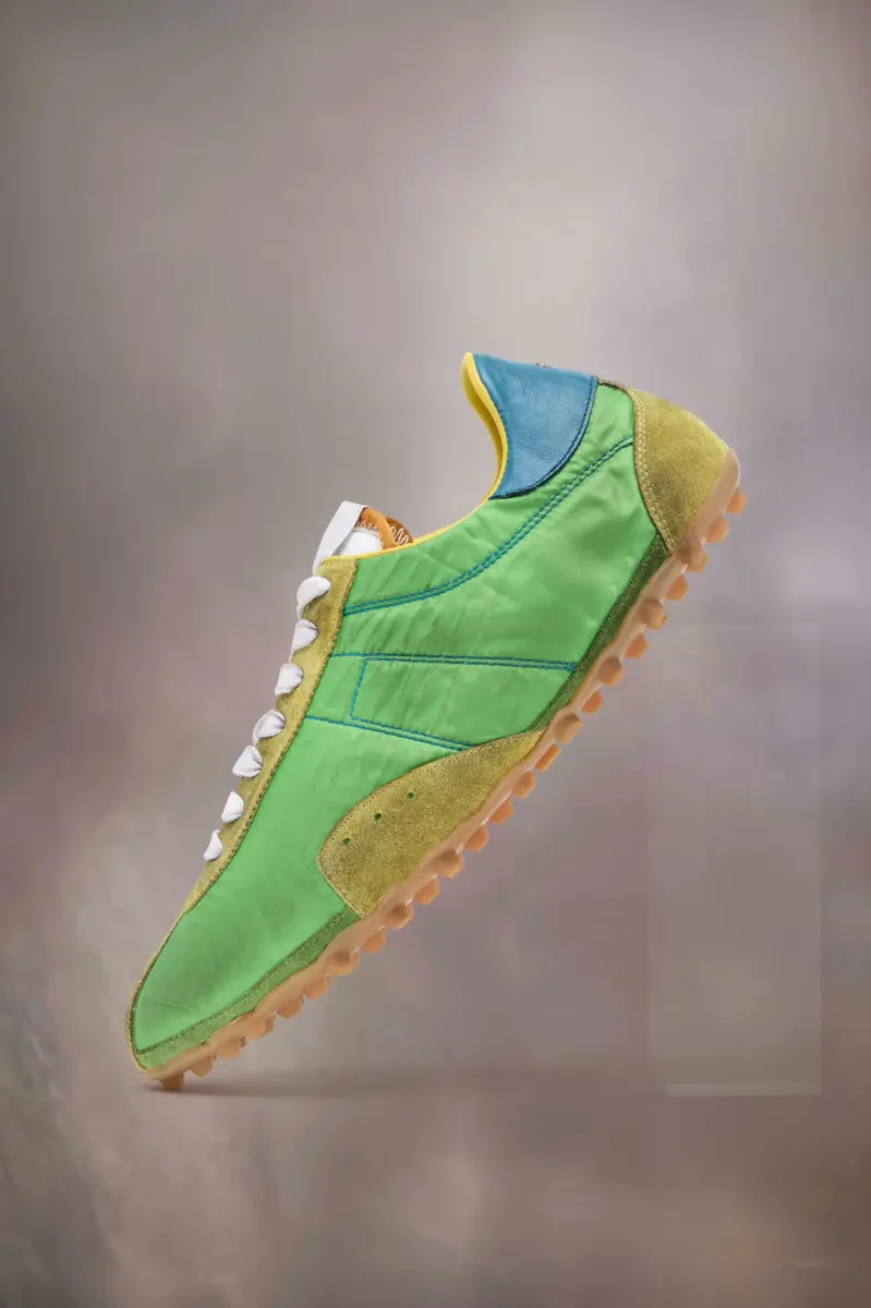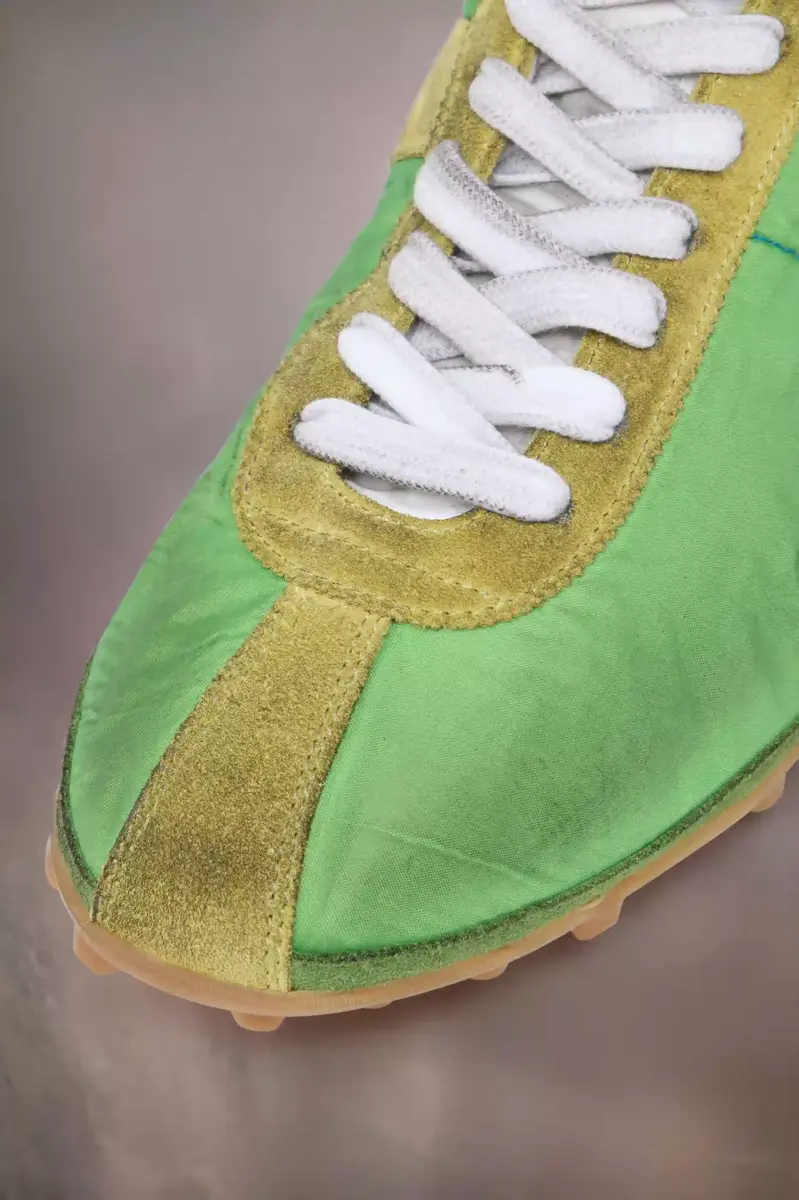 Realizzata in nylon, suede e pelle di vitello, con trattamento vintage, la silhouette Sprinters si ispira alle scarpe da running retrò. Il contrasto cromatico a blocchi si sposa con la classica linguetta con il logo numerico. La suola carrarmato presenta anche il dettaglio numerico, con il 22 cerchiato a indicare la collezione di calzature della Maison. La cucitura distintiva di Maison Margiela appare sul retro.