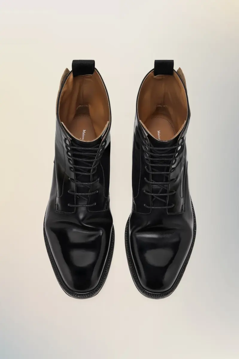 Questi stivali sono realizzati in pelle di vitello spazzolata, lavata a mano, lavorata e ribagnata, che accentua le pieghe con il tempo. I tradizionali chiodi sul tallone e un dettaglio Décortiqué mettono in mostra la struttura interna, evidenziando l’autentica artigianalità e le tecniche tradizionali di fabbricazione delle calzature. La cucitura bianca distintiva di Maison Margiela appare sul retro.